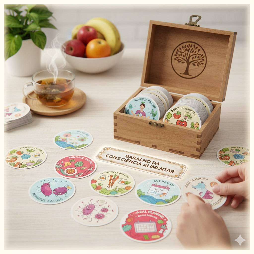 O Baralho da Consciência Alimentar ajuda você a entender a fome emocional, acolher seus sentimentos e desenvolver uma relação mais leve e consciente com a comida.